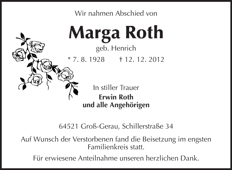 Hier finden Sie alle Traueranzeigen aus der Zeitung, die bisher für Marga Roth erschienen sind. Weitere Traueranzeigen, die in der Zeitung erscheinen, werden hier ebenfalls aufgelistet