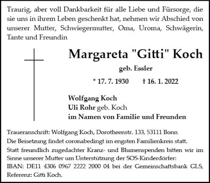 Hier finden Sie alle Traueranzeigen aus der Zeitung, die bisher für Margareta Koch erschienen sind. Weitere Traueranzeigen, die in der Zeitung erscheinen, werden hier ebenfalls aufgelistet