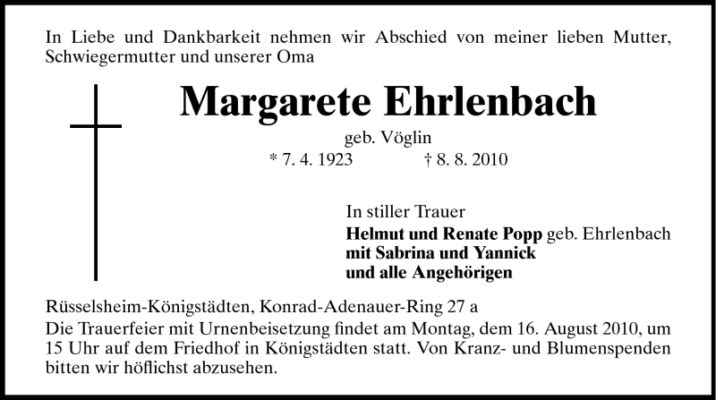 Hier finden Sie alle Traueranzeigen aus der Zeitung, die bisher für Margarete Ehrlenbach erschienen sind. Weitere Traueranzeigen, die in der Zeitung erscheinen, werden hier ebenfalls aufgelistet
