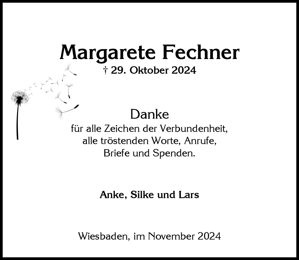 Hier finden Sie alle Traueranzeigen aus der Zeitung, die bisher für Margarete Fechner erschienen sind. Weitere Traueranzeigen, die in der Zeitung erscheinen, werden hier ebenfalls aufgelistet