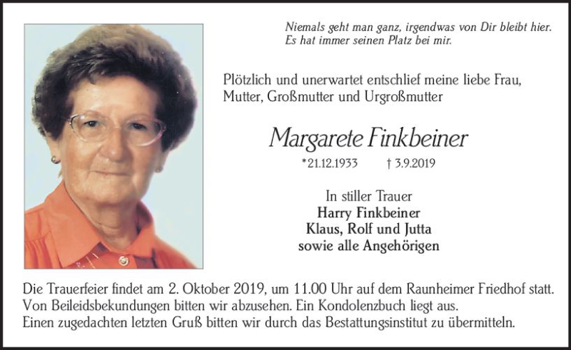 Hier finden Sie alle Traueranzeigen aus der Zeitung, die bisher für Margarete Finkbeiner erschienen sind. Weitere Traueranzeigen, die in der Zeitung erscheinen, werden hier ebenfalls aufgelistet