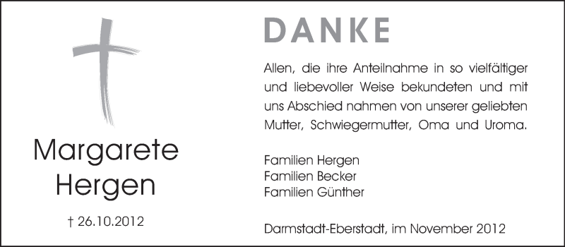Hier finden Sie alle Traueranzeigen aus der Zeitung, die bisher für Margarete Hergen erschienen sind. Weitere Traueranzeigen, die in der Zeitung erscheinen, werden hier ebenfalls aufgelistet