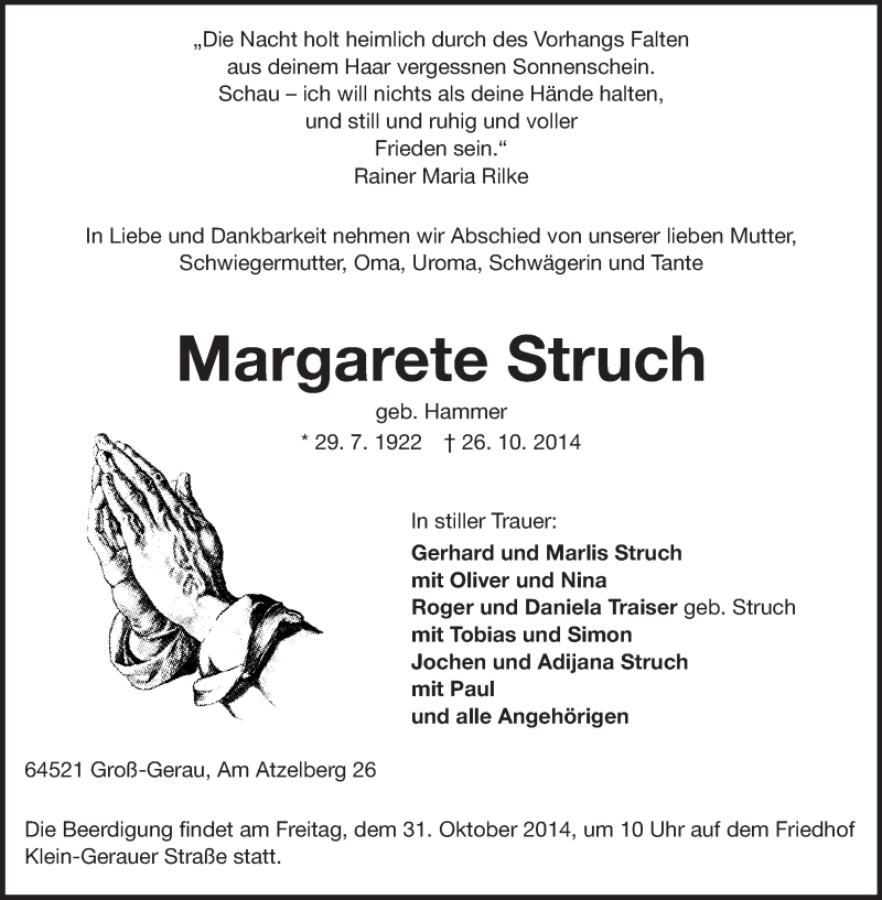 Hier finden Sie alle Traueranzeigen aus der Zeitung, die bisher für Margarete Struch erschienen sind. Weitere Traueranzeigen, die in der Zeitung erscheinen, werden hier ebenfalls aufgelistet