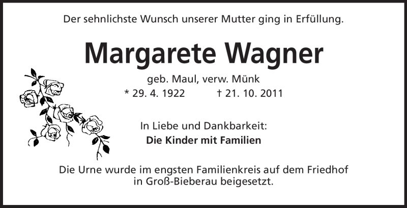 Hier finden Sie alle Traueranzeigen aus der Zeitung, die bisher für Margarete Wagner erschienen sind. Weitere Traueranzeigen, die in der Zeitung erscheinen, werden hier ebenfalls aufgelistet