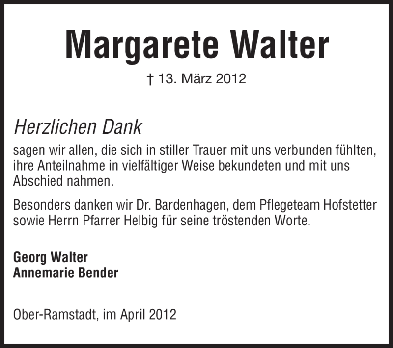 Hier finden Sie alle Traueranzeigen aus der Zeitung, die bisher für Margarete Walter erschienen sind. Weitere Traueranzeigen, die in der Zeitung erscheinen, werden hier ebenfalls aufgelistet