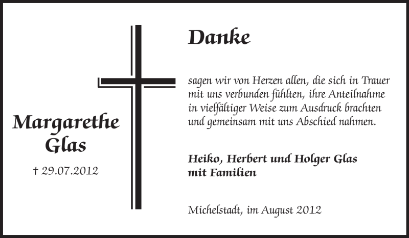 Hier finden Sie alle Traueranzeigen aus der Zeitung, die bisher für Margarethe Glas erschienen sind. Weitere Traueranzeigen, die in der Zeitung erscheinen, werden hier ebenfalls aufgelistet