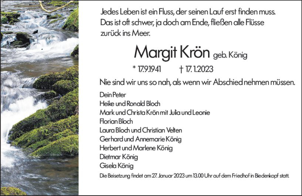Hier finden Sie alle Traueranzeigen aus der Zeitung, die bisher für Margit Krön erschienen sind. Weitere Traueranzeigen, die in der Zeitung erscheinen, werden hier ebenfalls aufgelistet
