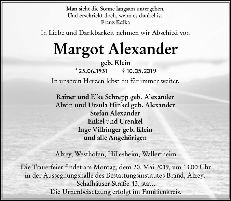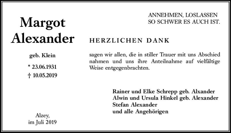 Hier finden Sie alle Traueranzeigen aus der Zeitung, die bisher für Margot Alexander erschienen sind. Weitere Traueranzeigen, die in der Zeitung erscheinen, werden hier ebenfalls aufgelistet