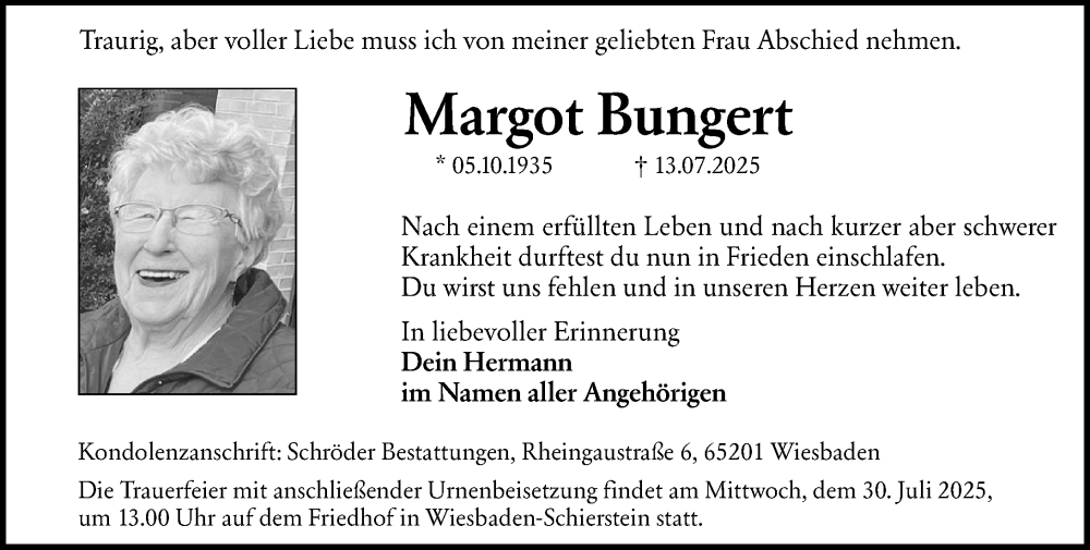 Hier finden Sie alle Traueranzeigen aus der Zeitung, die bisher für Margot Bungert erschienen sind. Weitere Traueranzeigen, die in der Zeitung erscheinen, werden hier ebenfalls aufgelistet