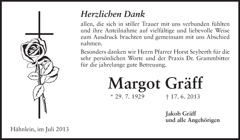 Hier finden Sie alle Traueranzeigen aus der Zeitung, die bisher für Margot Gräff erschienen sind. Weitere Traueranzeigen, die in der Zeitung erscheinen, werden hier ebenfalls aufgelistet