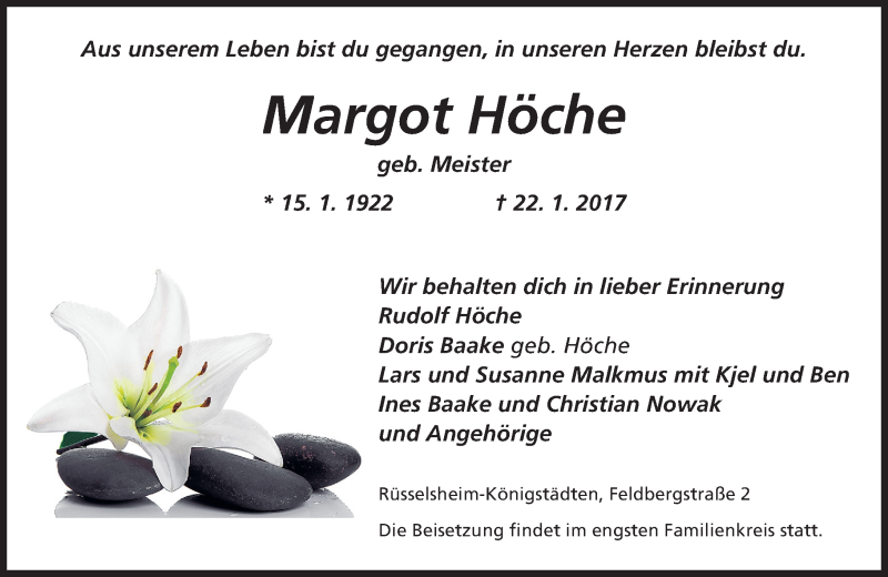 Hier finden Sie alle Traueranzeigen aus der Zeitung, die bisher für Margot Höche erschienen sind. Weitere Traueranzeigen, die in der Zeitung erscheinen, werden hier ebenfalls aufgelistet