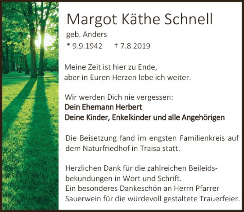 Hier finden Sie alle Traueranzeigen aus der Zeitung, die bisher für Margot Käthe Schnell erschienen sind. Weitere Traueranzeigen, die in der Zeitung erscheinen, werden hier ebenfalls aufgelistet