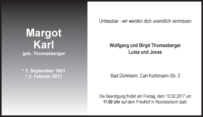 Hier finden Sie alle Traueranzeigen aus der Zeitung, die bisher für Margot Karl erschienen sind. Weitere Traueranzeigen, die in der Zeitung erscheinen, werden hier ebenfalls aufgelistet