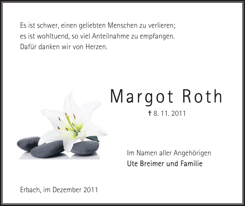 Hier finden Sie alle Traueranzeigen aus der Zeitung, die bisher für Margot Roth erschienen sind. Weitere Traueranzeigen, die in der Zeitung erscheinen, werden hier ebenfalls aufgelistet