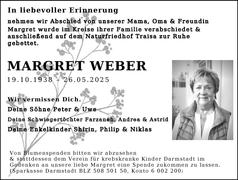 Hier finden Sie alle Traueranzeigen aus der Zeitung, die bisher für Margret Weber erschienen sind. Weitere Traueranzeigen, die in der Zeitung erscheinen, werden hier ebenfalls aufgelistet