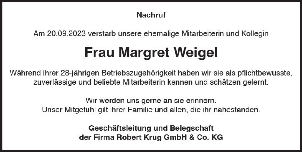 Hier finden Sie alle Traueranzeigen aus der Zeitung, die bisher für Margret Weigel erschienen sind. Weitere Traueranzeigen, die in der Zeitung erscheinen, werden hier ebenfalls aufgelistet