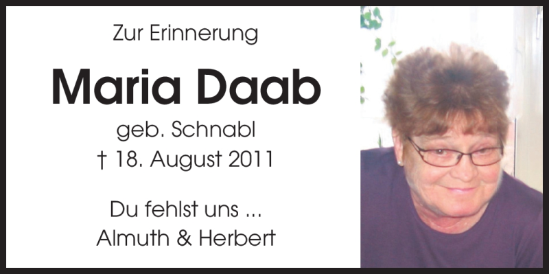 Hier finden Sie alle Traueranzeigen aus der Zeitung, die bisher für Maria Daab erschienen sind. Weitere Traueranzeigen, die in der Zeitung erscheinen, werden hier ebenfalls aufgelistet