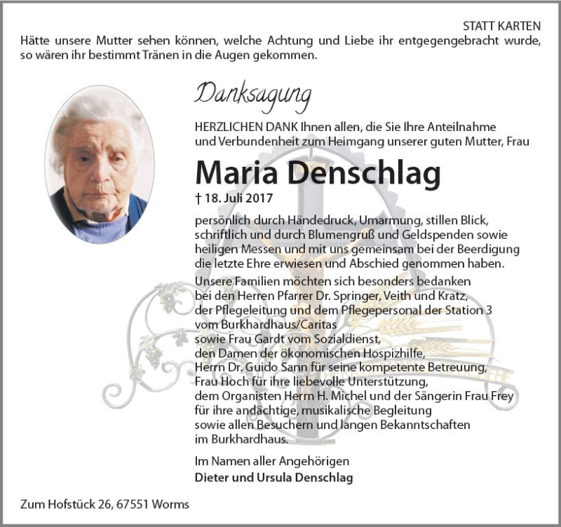Hier finden Sie alle Traueranzeigen aus der Zeitung, die bisher für Maria Denschlag erschienen sind. Weitere Traueranzeigen, die in der Zeitung erscheinen, werden hier ebenfalls aufgelistet