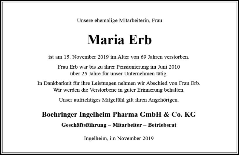 Hier finden Sie alle Traueranzeigen aus der Zeitung, die bisher für Maria Erb erschienen sind. Weitere Traueranzeigen, die in der Zeitung erscheinen, werden hier ebenfalls aufgelistet