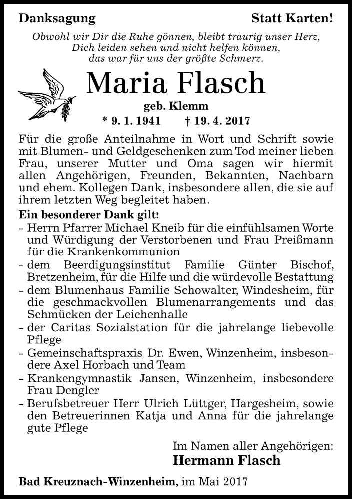 Hier finden Sie alle Traueranzeigen aus der Zeitung, die bisher für Maria Flasch erschienen sind. Weitere Traueranzeigen, die in der Zeitung erscheinen, werden hier ebenfalls aufgelistet