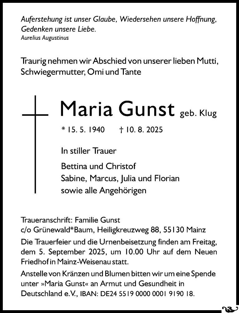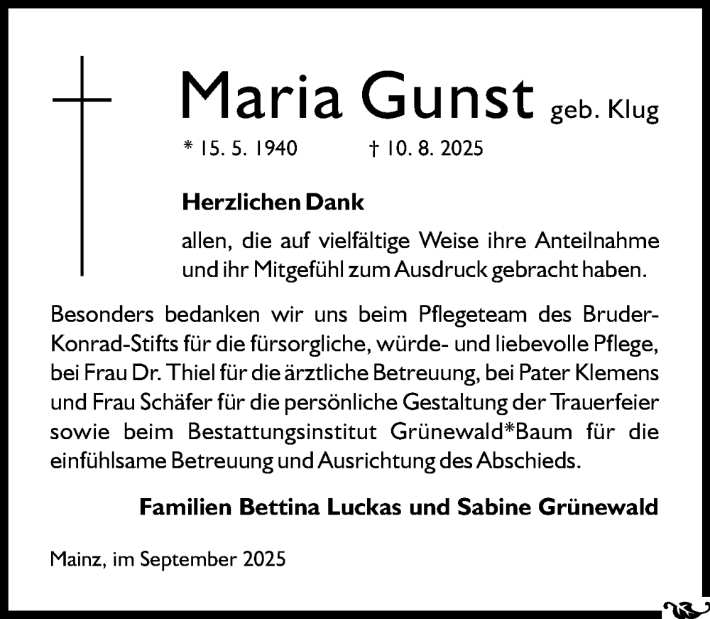 Hier finden Sie alle Traueranzeigen aus der Zeitung, die bisher für Maria Gunst erschienen sind. Weitere Traueranzeigen, die in der Zeitung erscheinen, werden hier ebenfalls aufgelistet