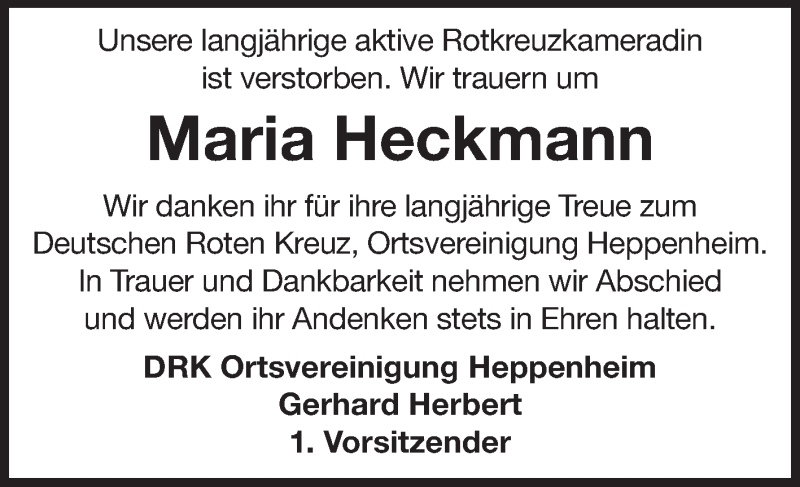 Hier finden Sie alle Traueranzeigen aus der Zeitung, die bisher für Maria Heckmann erschienen sind. Weitere Traueranzeigen, die in der Zeitung erscheinen, werden hier ebenfalls aufgelistet