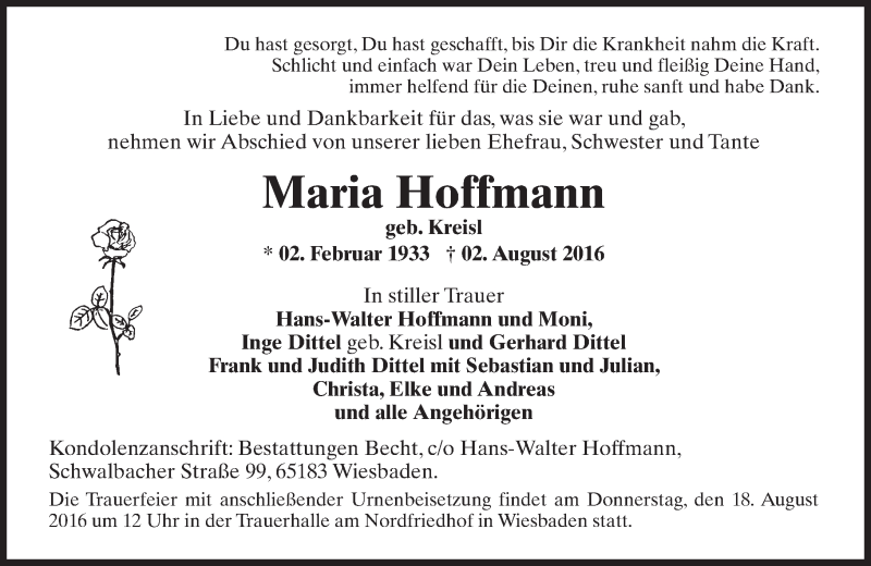 Hier finden Sie alle Traueranzeigen aus der Zeitung, die bisher für Maria Hoffmann erschienen sind. Weitere Traueranzeigen, die in der Zeitung erscheinen, werden hier ebenfalls aufgelistet