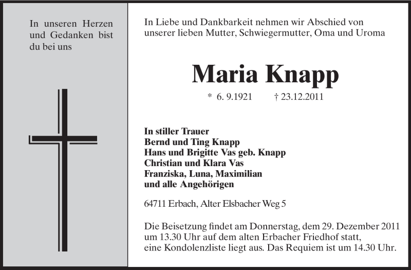 Hier finden Sie alle Traueranzeigen aus der Zeitung, die bisher für Maria Knapp erschienen sind. Weitere Traueranzeigen, die in der Zeitung erscheinen, werden hier ebenfalls aufgelistet