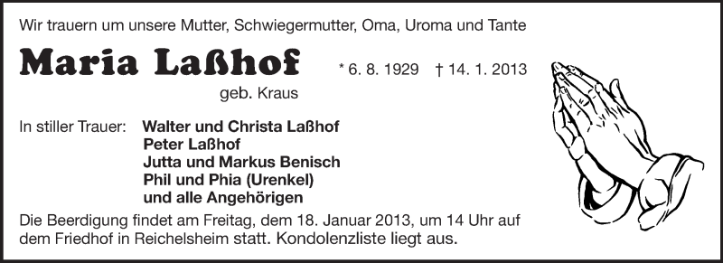 Hier finden Sie alle Traueranzeigen aus der Zeitung, die bisher für Maria Laßhof erschienen sind. Weitere Traueranzeigen, die in der Zeitung erscheinen, werden hier ebenfalls aufgelistet