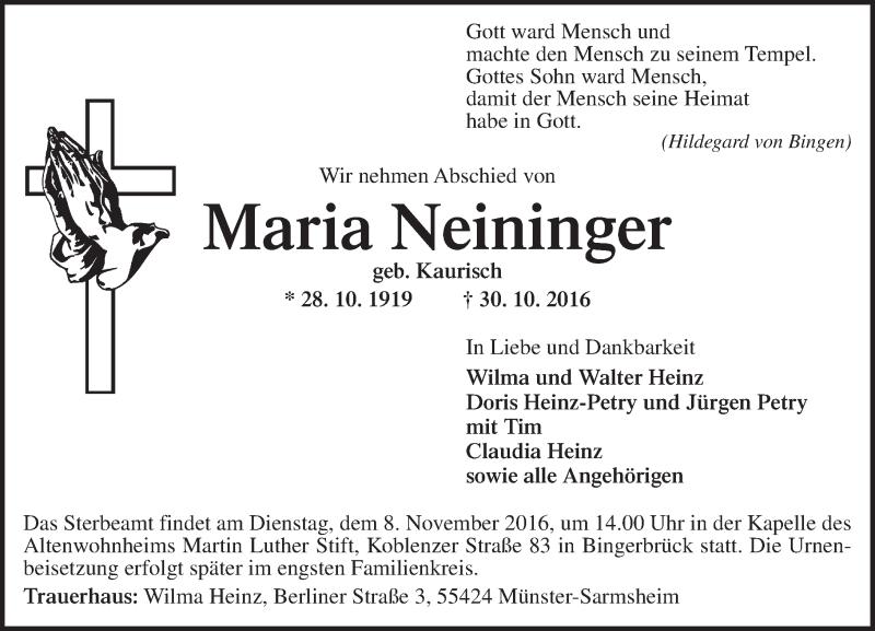 Hier finden Sie alle Traueranzeigen aus der Zeitung, die bisher für Maria Neininger erschienen sind. Weitere Traueranzeigen, die in der Zeitung erscheinen, werden hier ebenfalls aufgelistet