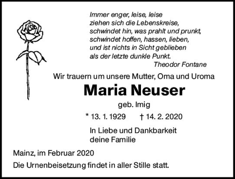 Hier finden Sie alle Traueranzeigen aus der Zeitung, die bisher für Maria Neuser erschienen sind. Weitere Traueranzeigen, die in der Zeitung erscheinen, werden hier ebenfalls aufgelistet