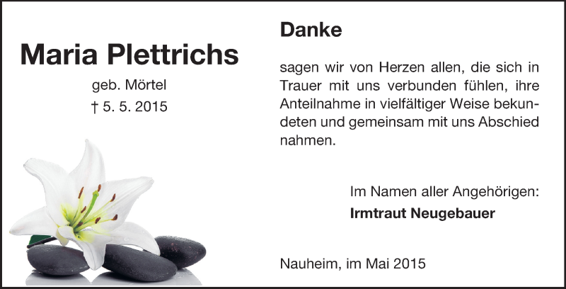 Hier finden Sie alle Traueranzeigen aus der Zeitung, die bisher für Maria Plettrichs erschienen sind. Weitere Traueranzeigen, die in der Zeitung erscheinen, werden hier ebenfalls aufgelistet