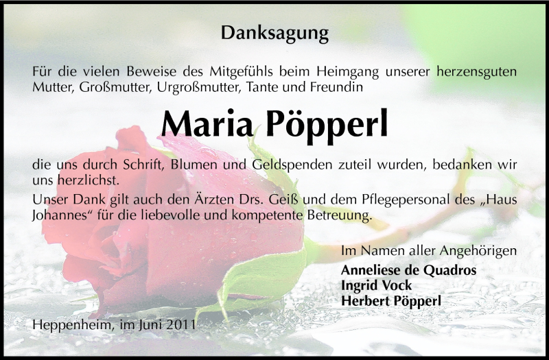 Hier finden Sie alle Traueranzeigen aus der Zeitung, die bisher für Maria Pöpperl erschienen sind. Weitere Traueranzeigen, die in der Zeitung erscheinen, werden hier ebenfalls aufgelistet