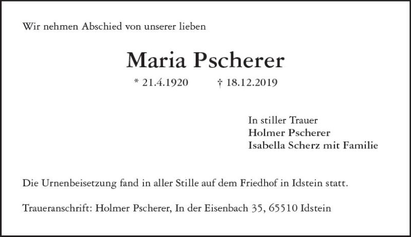 Hier finden Sie alle Traueranzeigen aus der Zeitung, die bisher für Maria Pscherer erschienen sind. Weitere Traueranzeigen, die in der Zeitung erscheinen, werden hier ebenfalls aufgelistet
