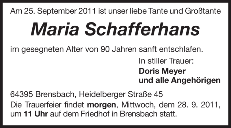 Hier finden Sie alle Traueranzeigen aus der Zeitung, die bisher für Maria Schafferhans erschienen sind. Weitere Traueranzeigen, die in der Zeitung erscheinen, werden hier ebenfalls aufgelistet