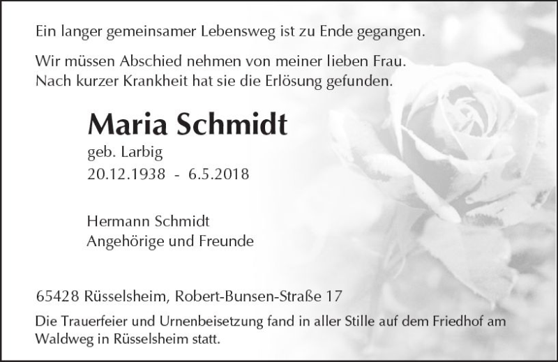Hier finden Sie alle Traueranzeigen aus der Zeitung, die bisher für Maria Schmidt erschienen sind. Weitere Traueranzeigen, die in der Zeitung erscheinen, werden hier ebenfalls aufgelistet