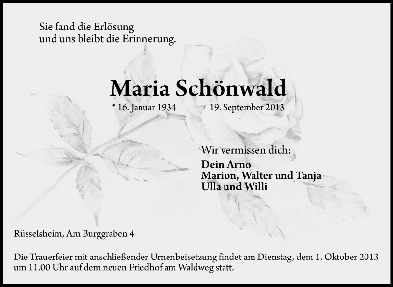 Hier finden Sie alle Traueranzeigen aus der Zeitung, die bisher für Maria Schönwald erschienen sind. Weitere Traueranzeigen, die in der Zeitung erscheinen, werden hier ebenfalls aufgelistet