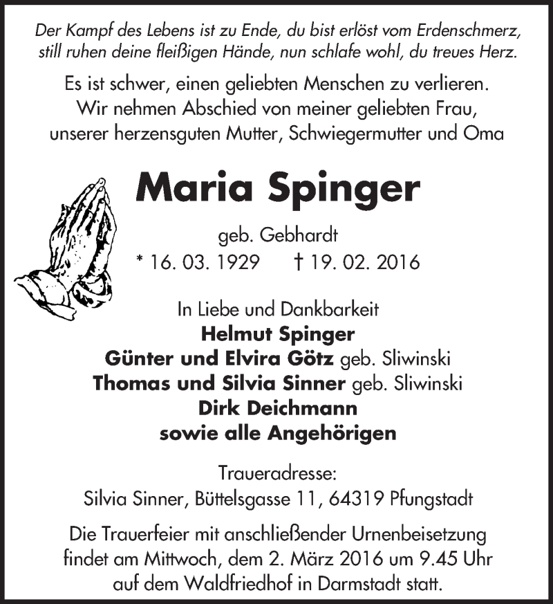 Hier finden Sie alle Traueranzeigen aus der Zeitung, die bisher für Maria Spinger erschienen sind. Weitere Traueranzeigen, die in der Zeitung erscheinen, werden hier ebenfalls aufgelistet