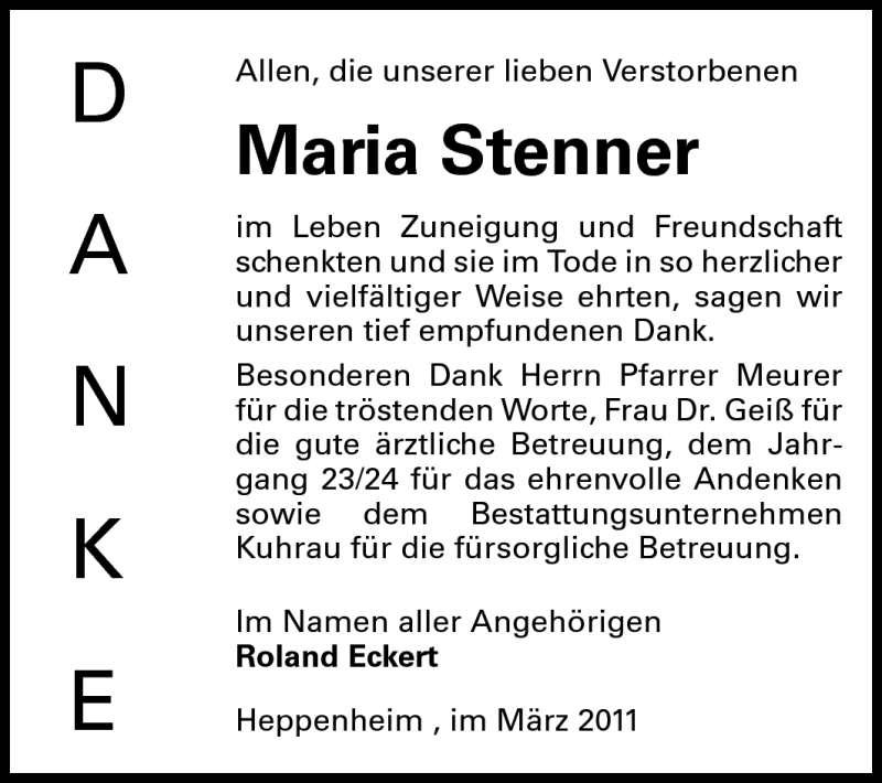 Hier finden Sie alle Traueranzeigen aus der Zeitung, die bisher für Maria Stenner erschienen sind. Weitere Traueranzeigen, die in der Zeitung erscheinen, werden hier ebenfalls aufgelistet