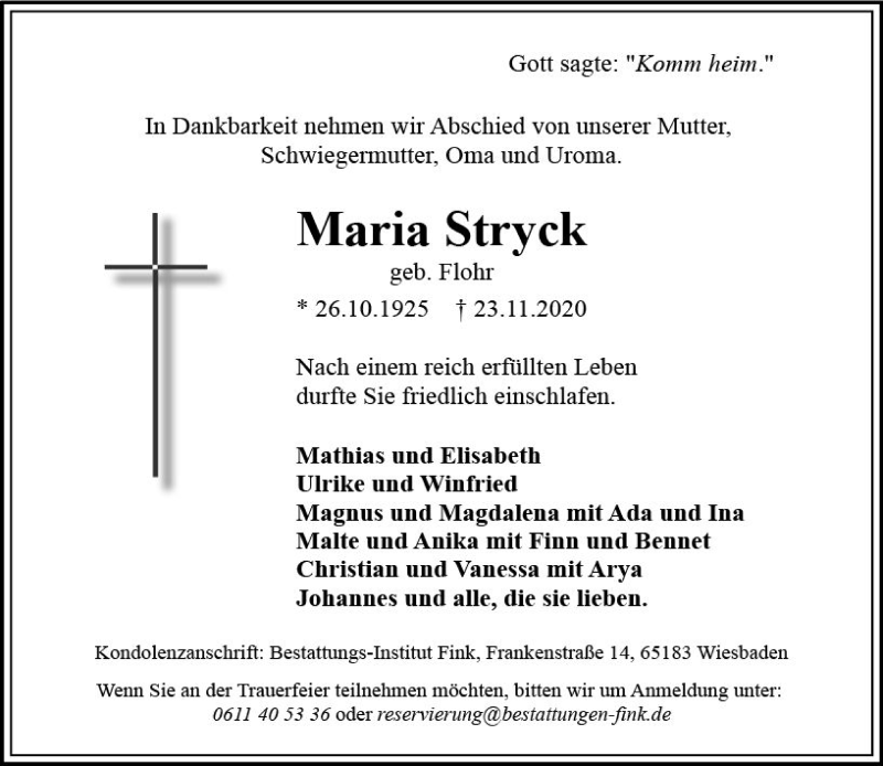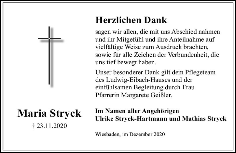 Hier finden Sie alle Traueranzeigen aus der Zeitung, die bisher für Maria Stryck erschienen sind. Weitere Traueranzeigen, die in der Zeitung erscheinen, werden hier ebenfalls aufgelistet