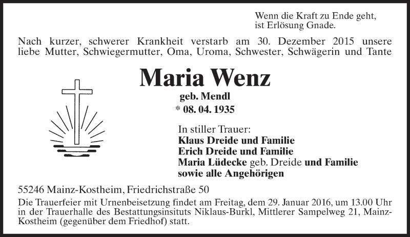 Hier finden Sie alle Traueranzeigen aus der Zeitung, die bisher für Maria Wenz erschienen sind. Weitere Traueranzeigen, die in der Zeitung erscheinen, werden hier ebenfalls aufgelistet