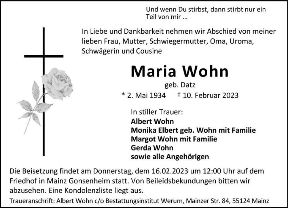 Hier finden Sie alle Traueranzeigen aus der Zeitung, die bisher für Maria Wohn erschienen sind. Weitere Traueranzeigen, die in der Zeitung erscheinen, werden hier ebenfalls aufgelistet