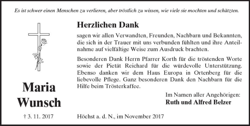 Hier finden Sie alle Traueranzeigen aus der Zeitung, die bisher für Maria Wunsch erschienen sind. Weitere Traueranzeigen, die in der Zeitung erscheinen, werden hier ebenfalls aufgelistet