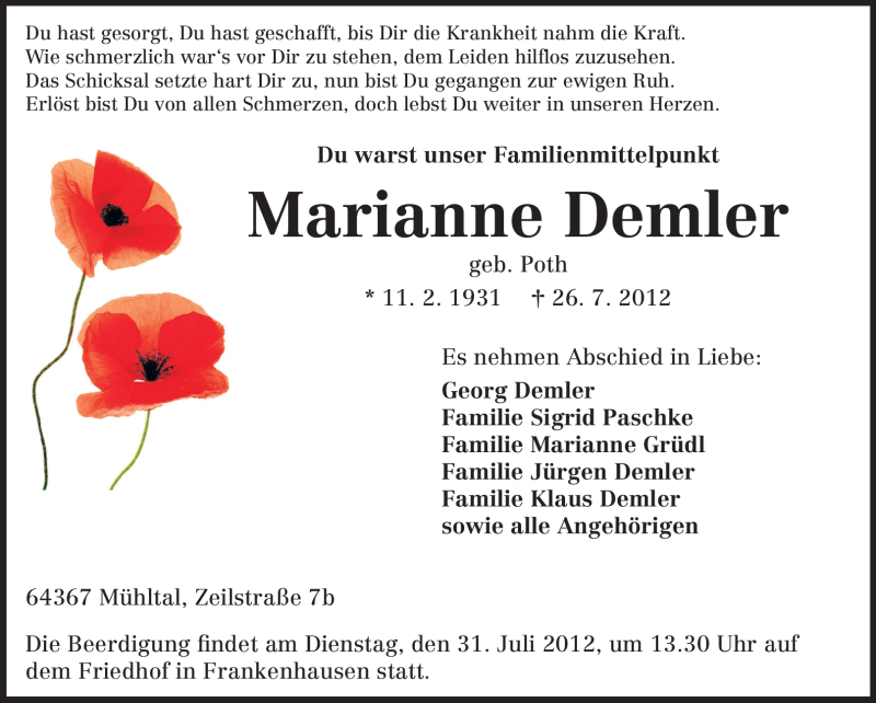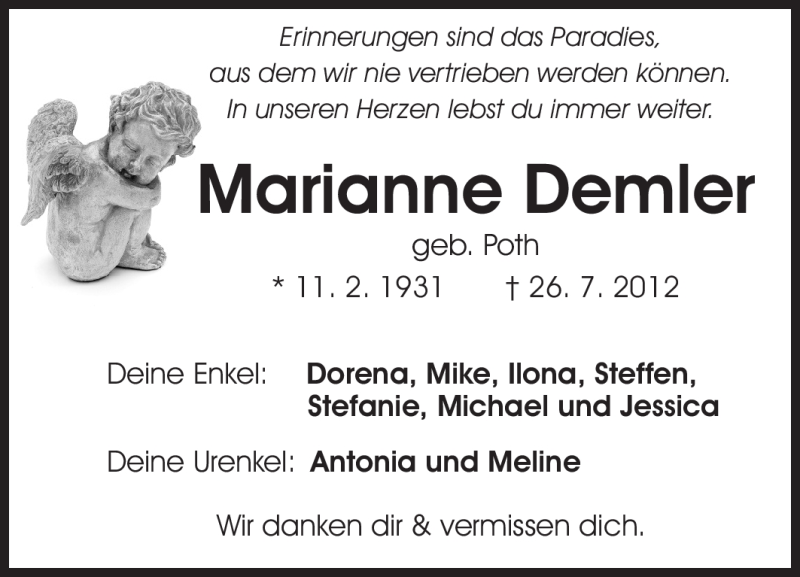 Hier finden Sie alle Traueranzeigen aus der Zeitung, die bisher für Marianne Demler erschienen sind. Weitere Traueranzeigen, die in der Zeitung erscheinen, werden hier ebenfalls aufgelistet