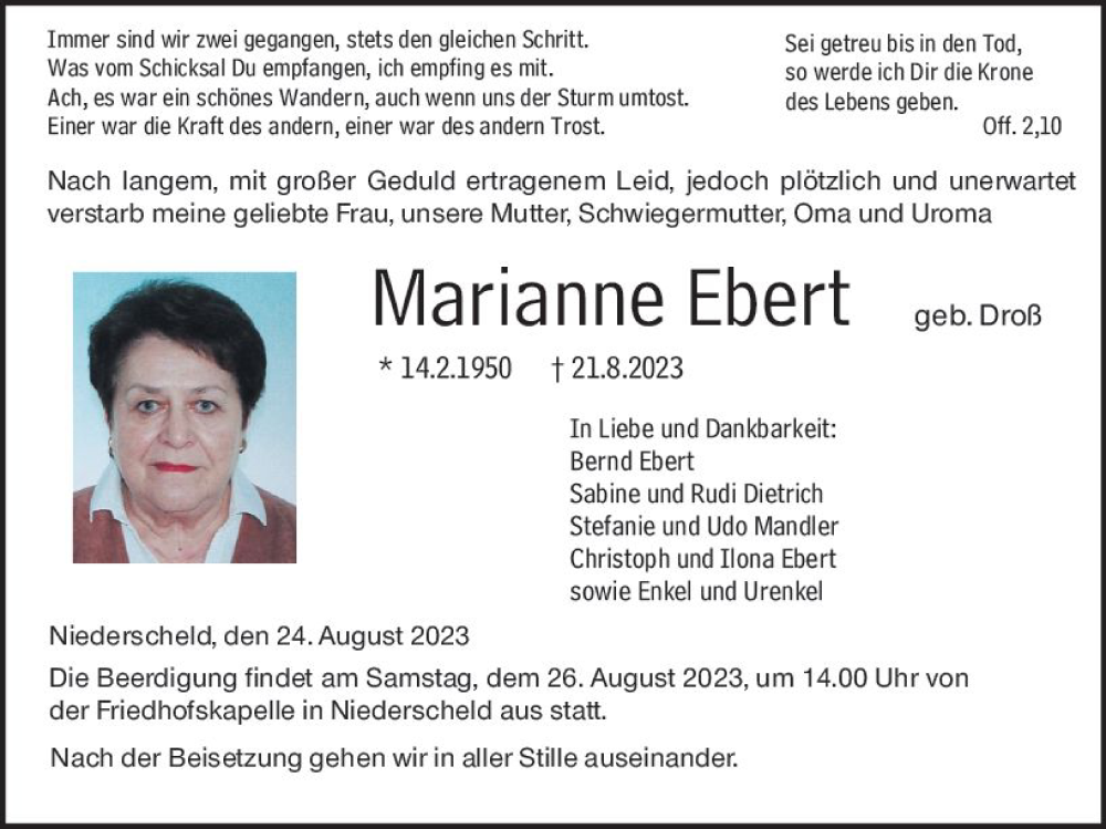 Hier finden Sie alle Traueranzeigen aus der Zeitung, die bisher für Marianne Ebert erschienen sind. Weitere Traueranzeigen, die in der Zeitung erscheinen, werden hier ebenfalls aufgelistet