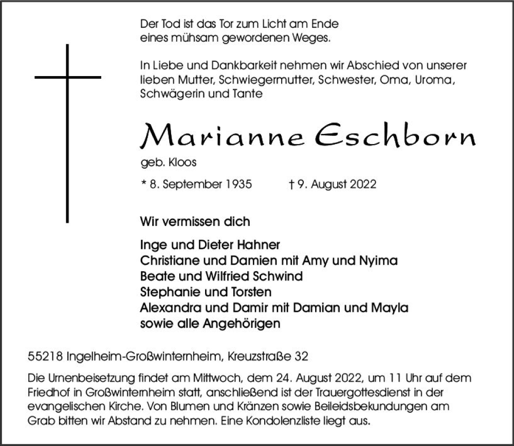 Hier finden Sie alle Traueranzeigen aus der Zeitung, die bisher für Marianne Eschborn erschienen sind. Weitere Traueranzeigen, die in der Zeitung erscheinen, werden hier ebenfalls aufgelistet
