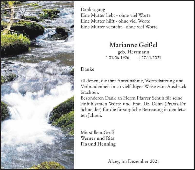 Hier finden Sie alle Traueranzeigen aus der Zeitung, die bisher für Marianne Geißel erschienen sind. Weitere Traueranzeigen, die in der Zeitung erscheinen, werden hier ebenfalls aufgelistet
