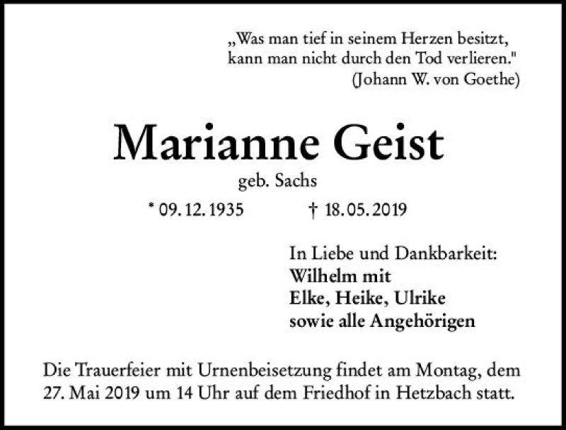 Hier finden Sie alle Traueranzeigen aus der Zeitung, die bisher für Marianne Geist erschienen sind. Weitere Traueranzeigen, die in der Zeitung erscheinen, werden hier ebenfalls aufgelistet