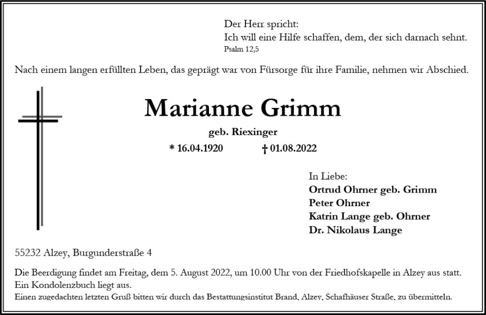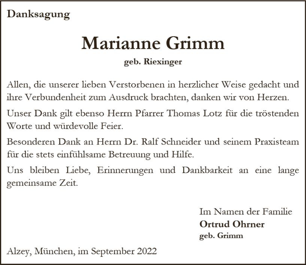 Hier finden Sie alle Traueranzeigen aus der Zeitung, die bisher für Marianne Grimm erschienen sind. Weitere Traueranzeigen, die in der Zeitung erscheinen, werden hier ebenfalls aufgelistet