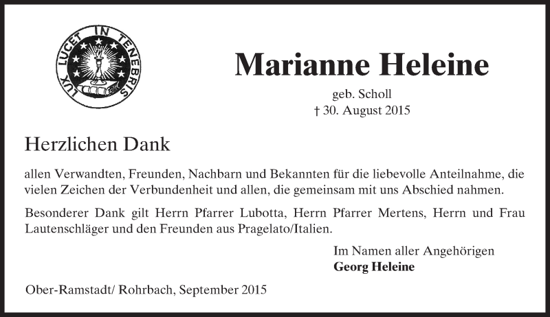 Hier finden Sie alle Traueranzeigen aus der Zeitung, die bisher für Marianne Heleine erschienen sind. Weitere Traueranzeigen, die in der Zeitung erscheinen, werden hier ebenfalls aufgelistet